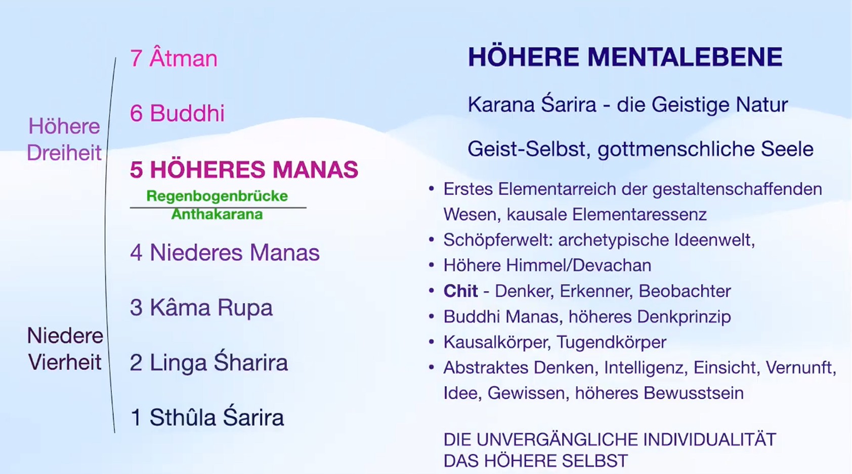 Beim schwierigen Manas-Prinizip bestehen manchmal Mißverständnisse. Es ist zweigeteilt und trennt den sterblichen vom unsterblichen Menschen: Höheres und niederes Manas. Manas ist das Denkprinzip, von Sanskrit man, derMensch und der Denker (im Gegensatz zum Tier).