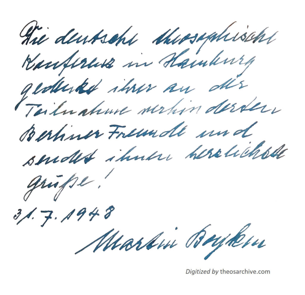 “The German theosophical conference in Hamburg commemorates its Berlin friends who were unable to attend and sends them warmest greetings!