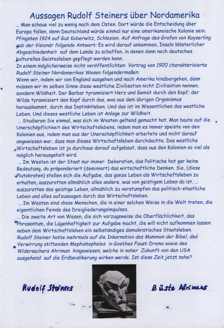 Rudolf Steiner hatte mehrmals auf die Inkarnation des Mammons der Bibel, des Verwirrung stiftenden Mephistopheles in Goethes Faust-Drama sowie des Widersachers Ahriman hingewiesen, welche in naher Zukunft von den USA ausgehend auf die Erdbevölkerung wirken werde. Ist diese Zeit jetzt nahe?